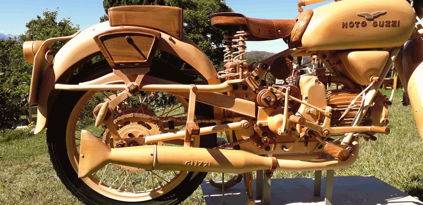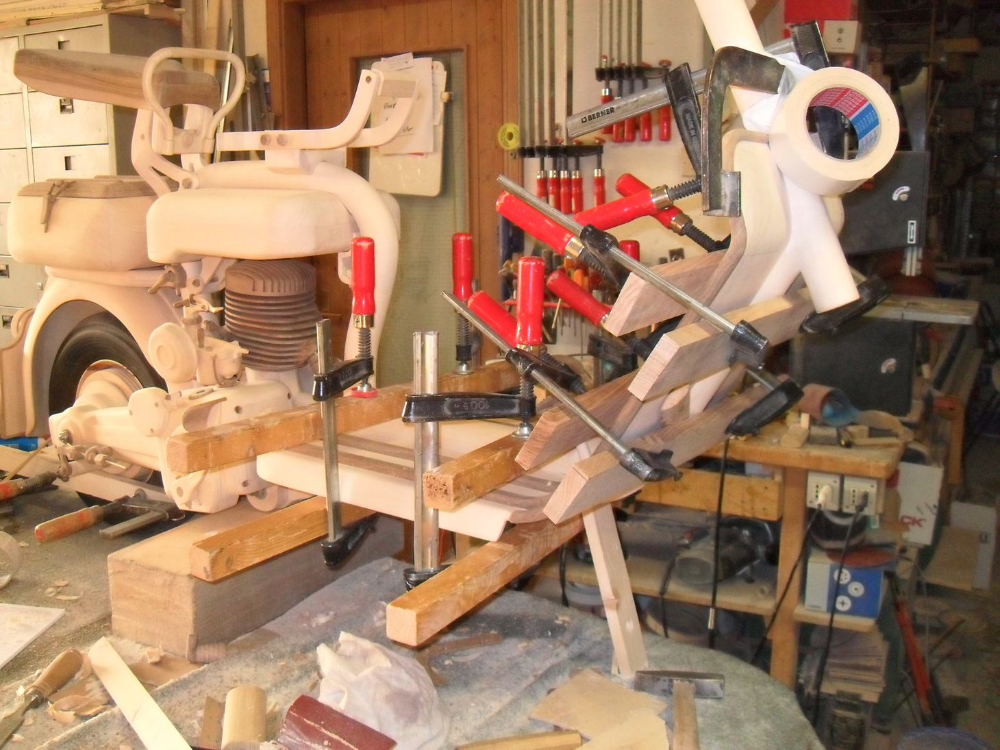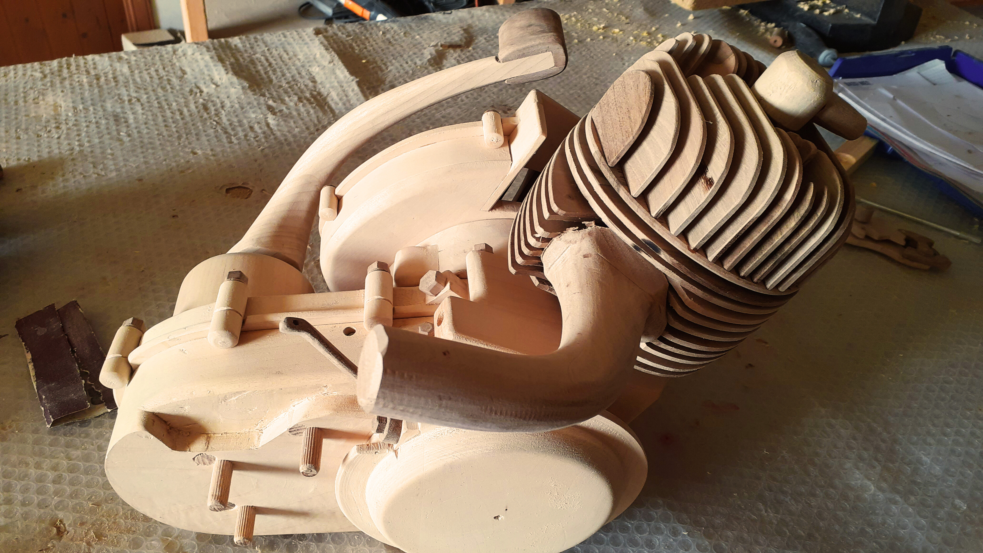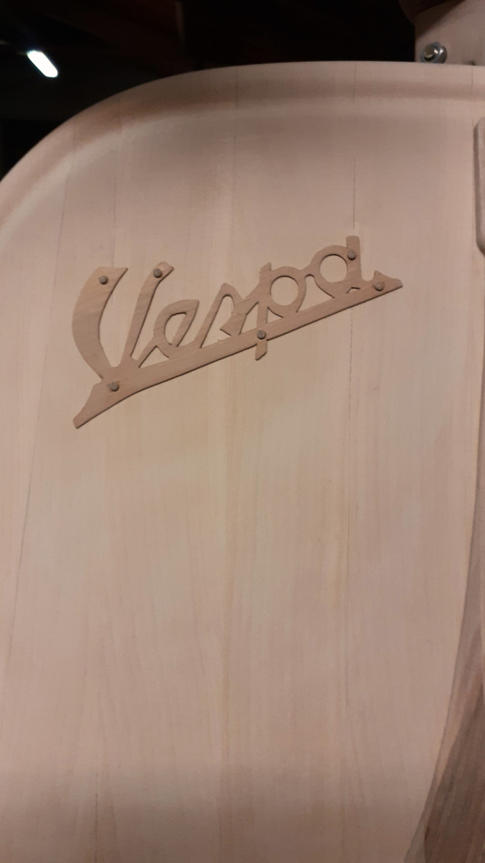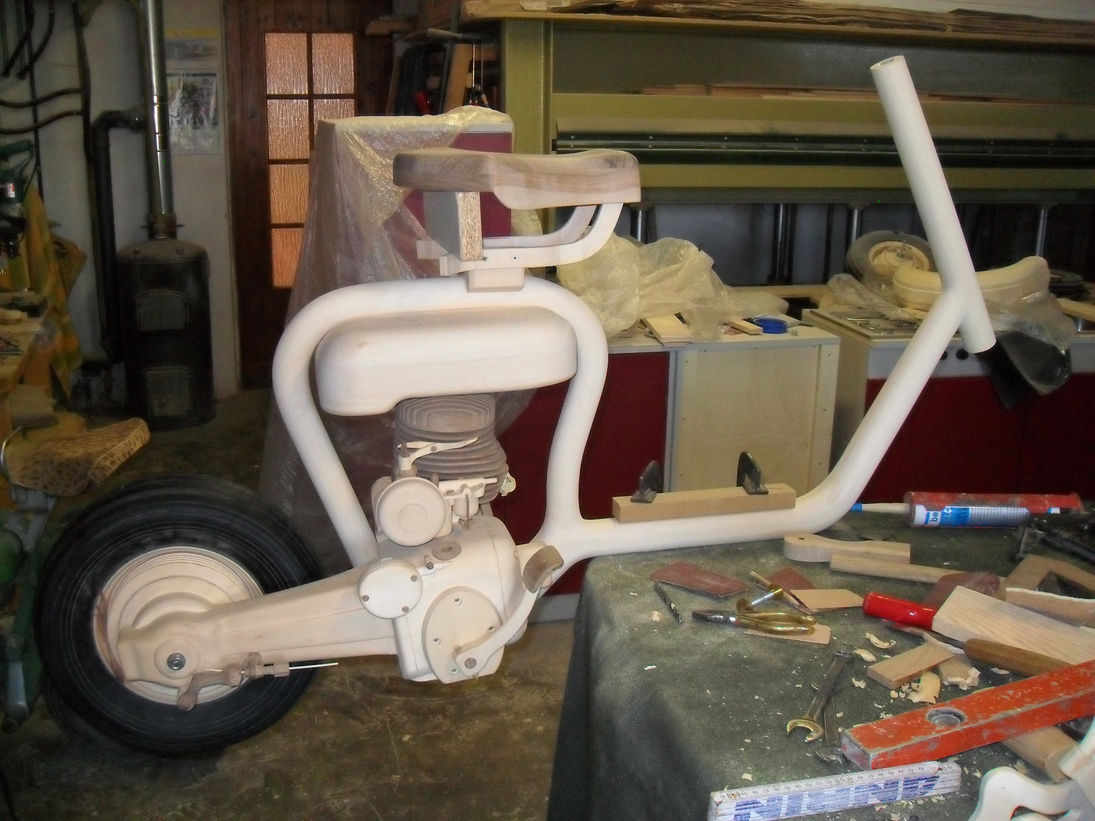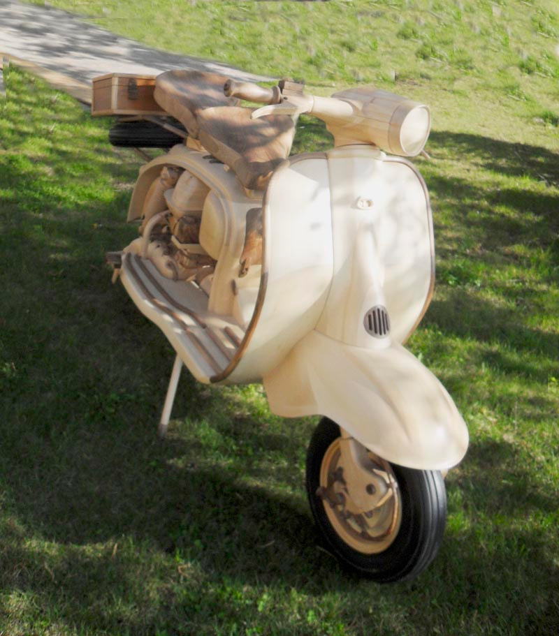 La realizzazione, con sgorbia e scalpello, della carrozzeria è stata particolarmente impegnativa per le sue linee curve, dalla bombatura alle insenature.