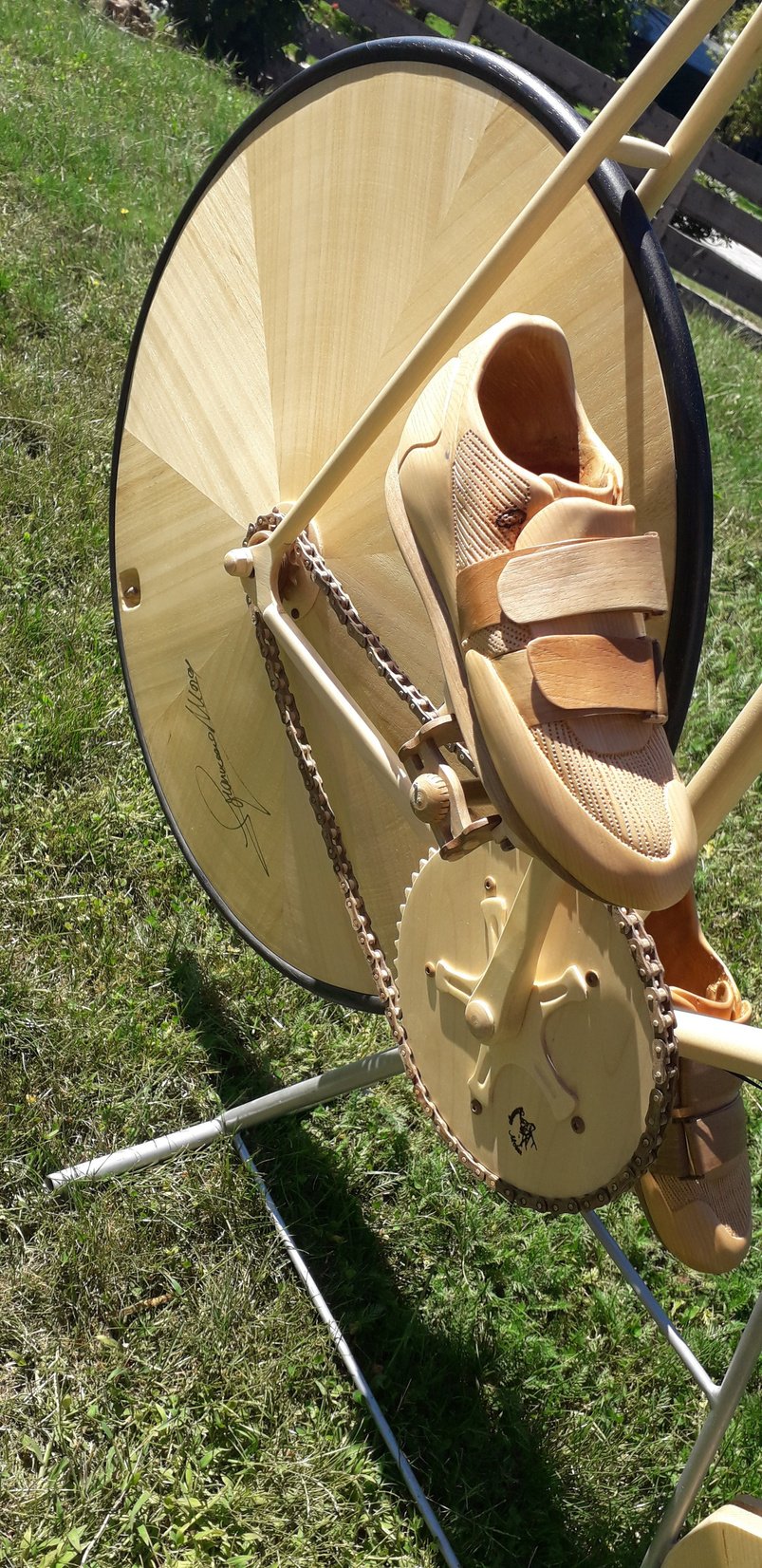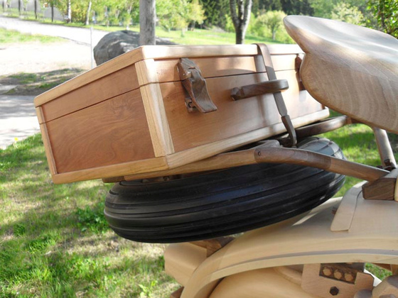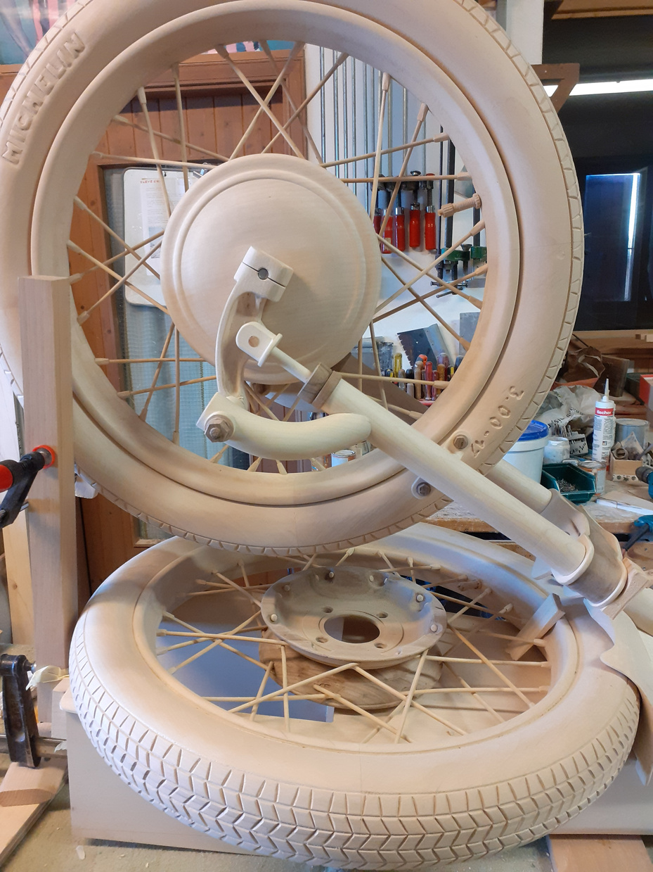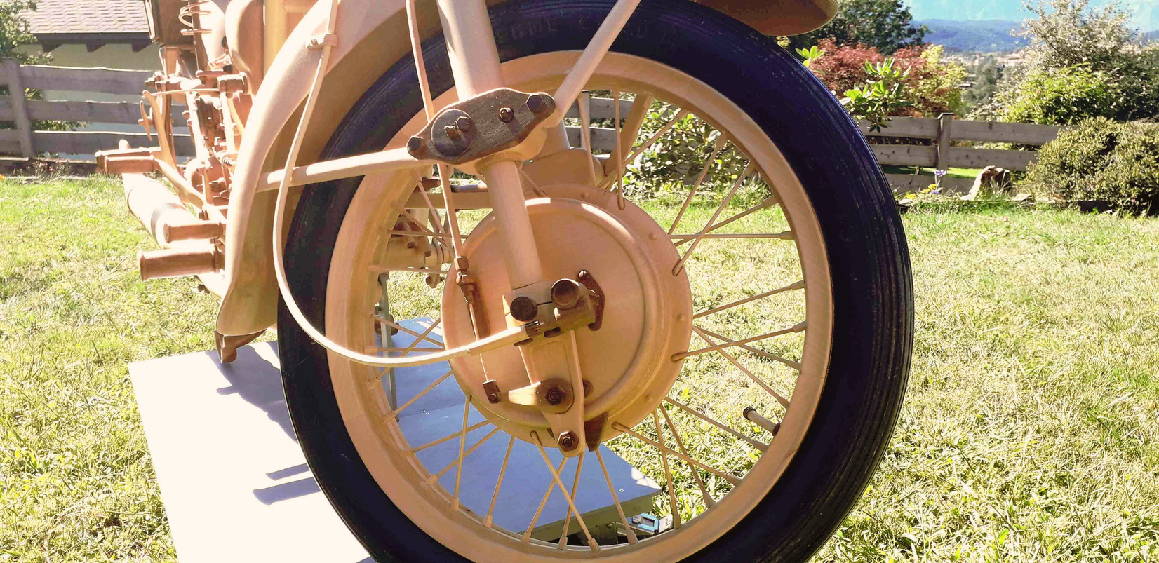 Le tre ruote, molto impegnative nella realizzazione, sono interamente in legno. La parte più gravosa è stata la carenatura.