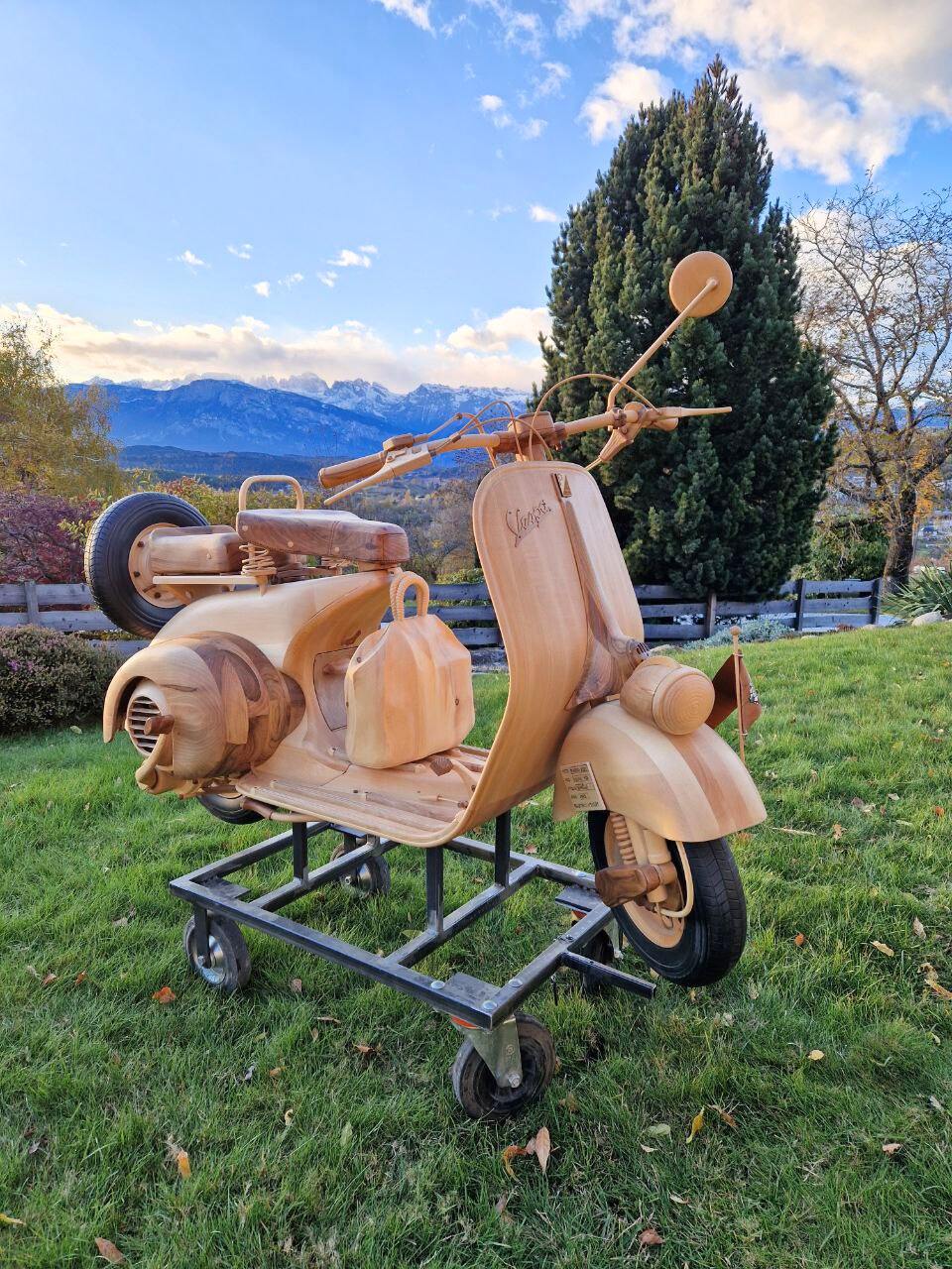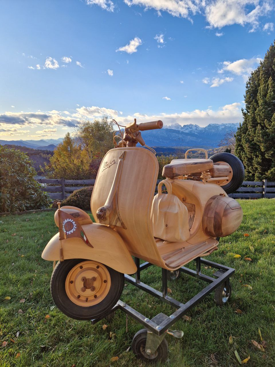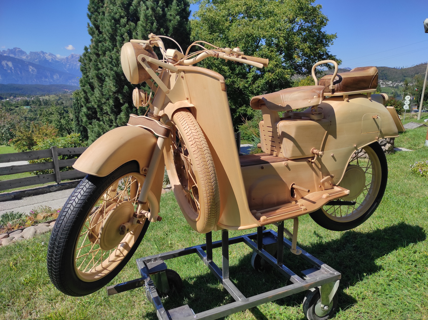 Le tre ruote, molto impegnative nella realizzazione, sono interamente in legno. La parte più gravosa è stata la carenatura.