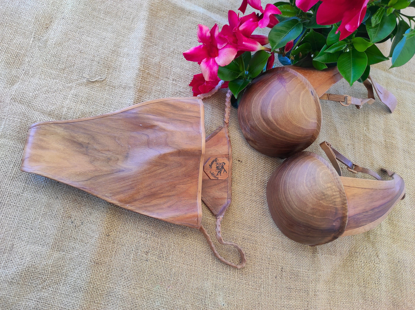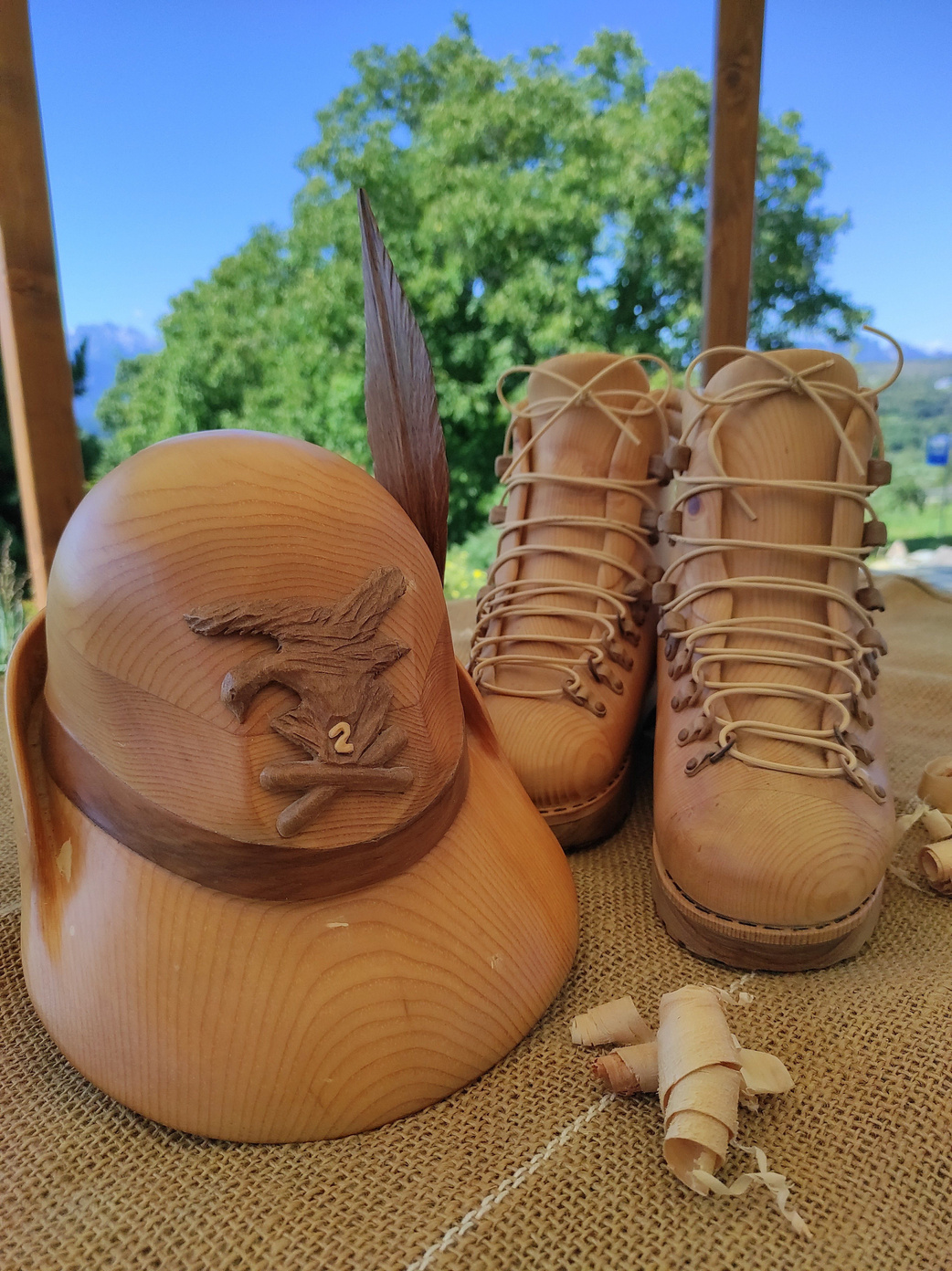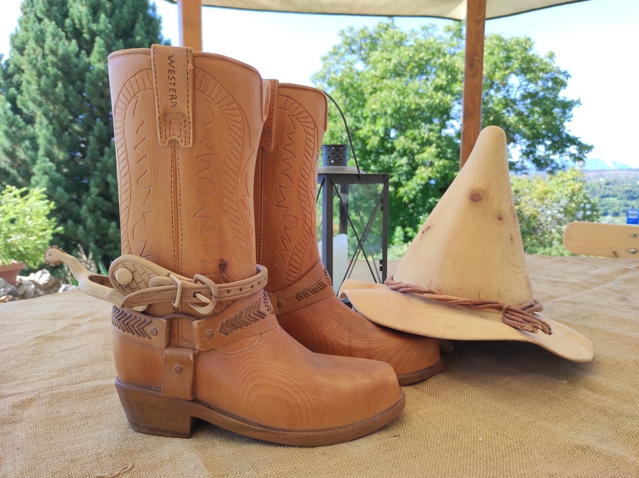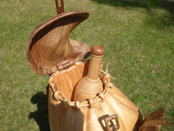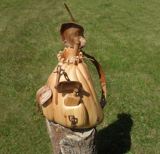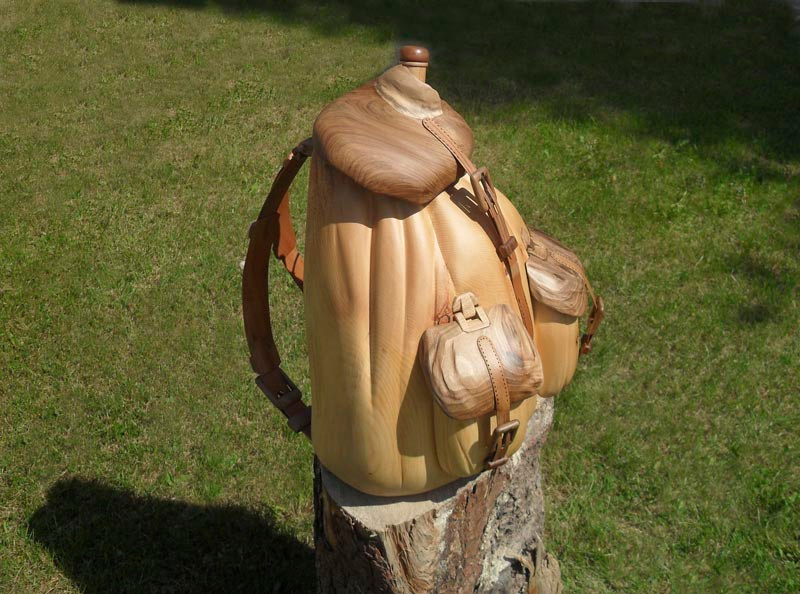 In legno di cirmolo, un pezzo unico scavato e modellato a mano, tasche e cinghie in legno di noce nazionale, una radice sottile