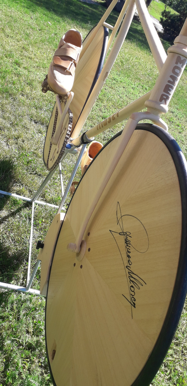 alla sua speciale bici dalle ruote lenticolari