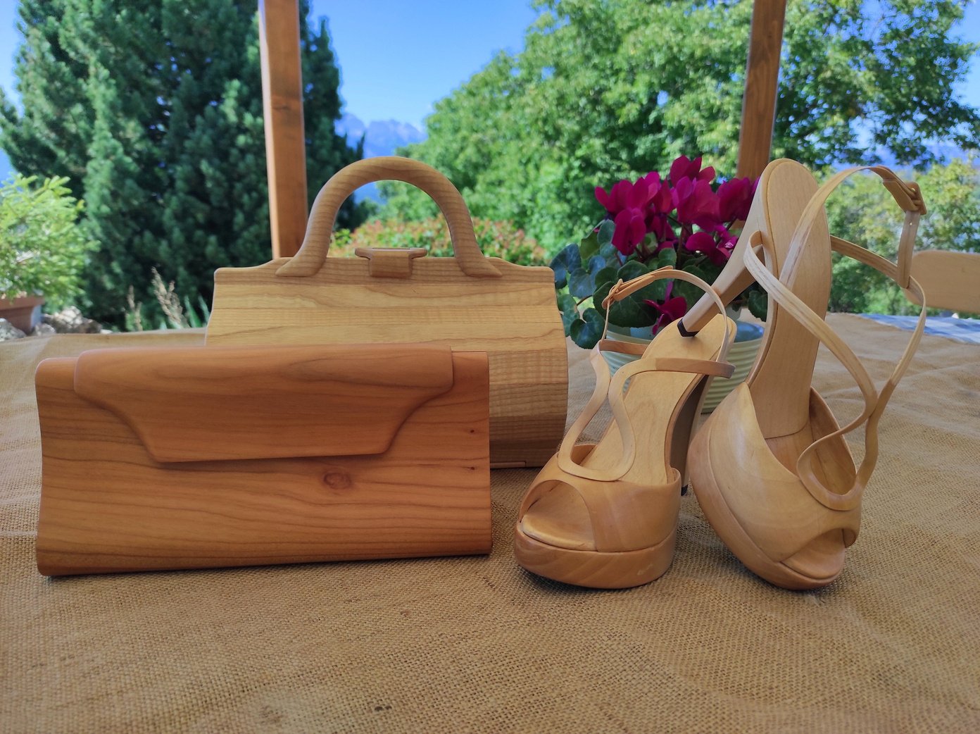 In legno di cirmolo, un pezzo unico scavato e modellato a mano, tasche e cinghie in legno di noce nazionale, una radice sottile