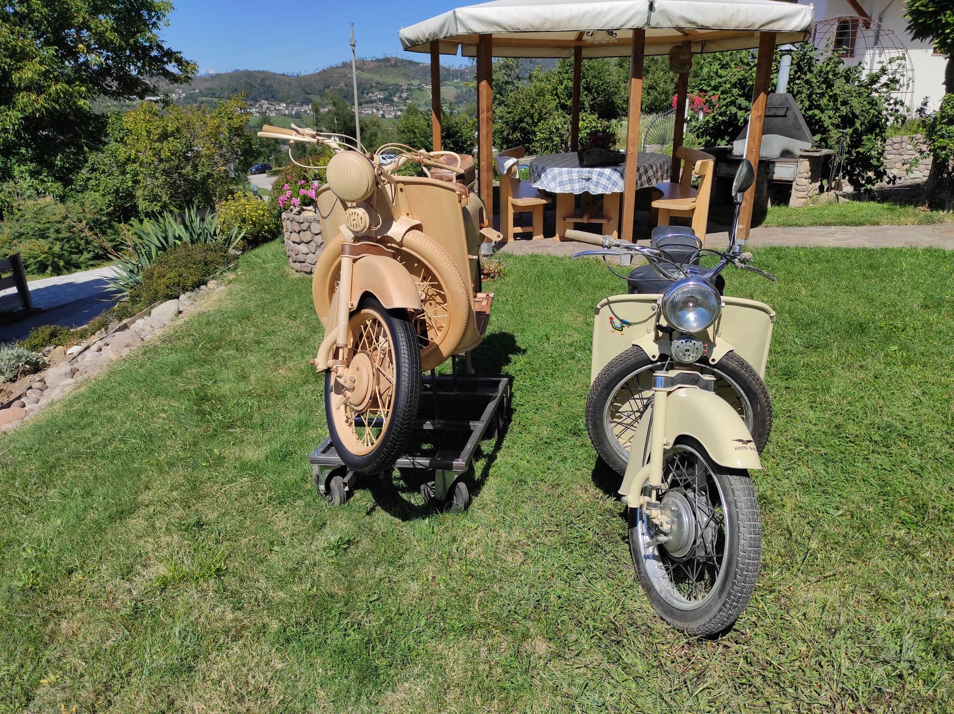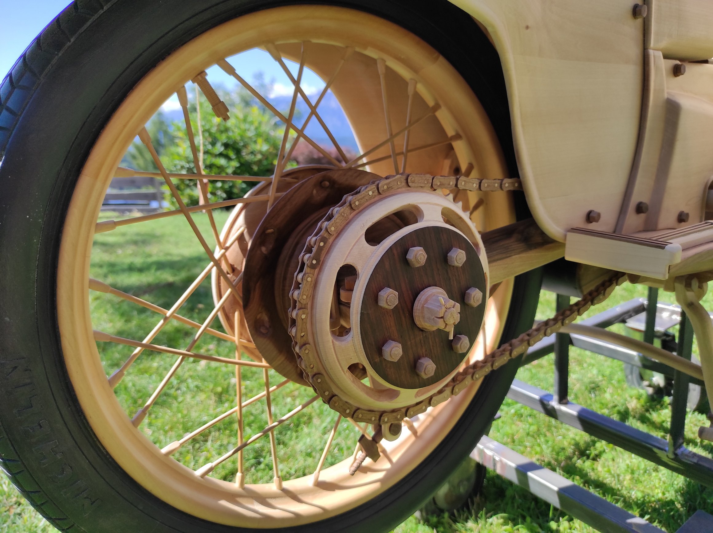 Le tre ruote, molto impegnative nella realizzazione, sono interamente in legno. La parte più gravosa è stata la carenatura.
